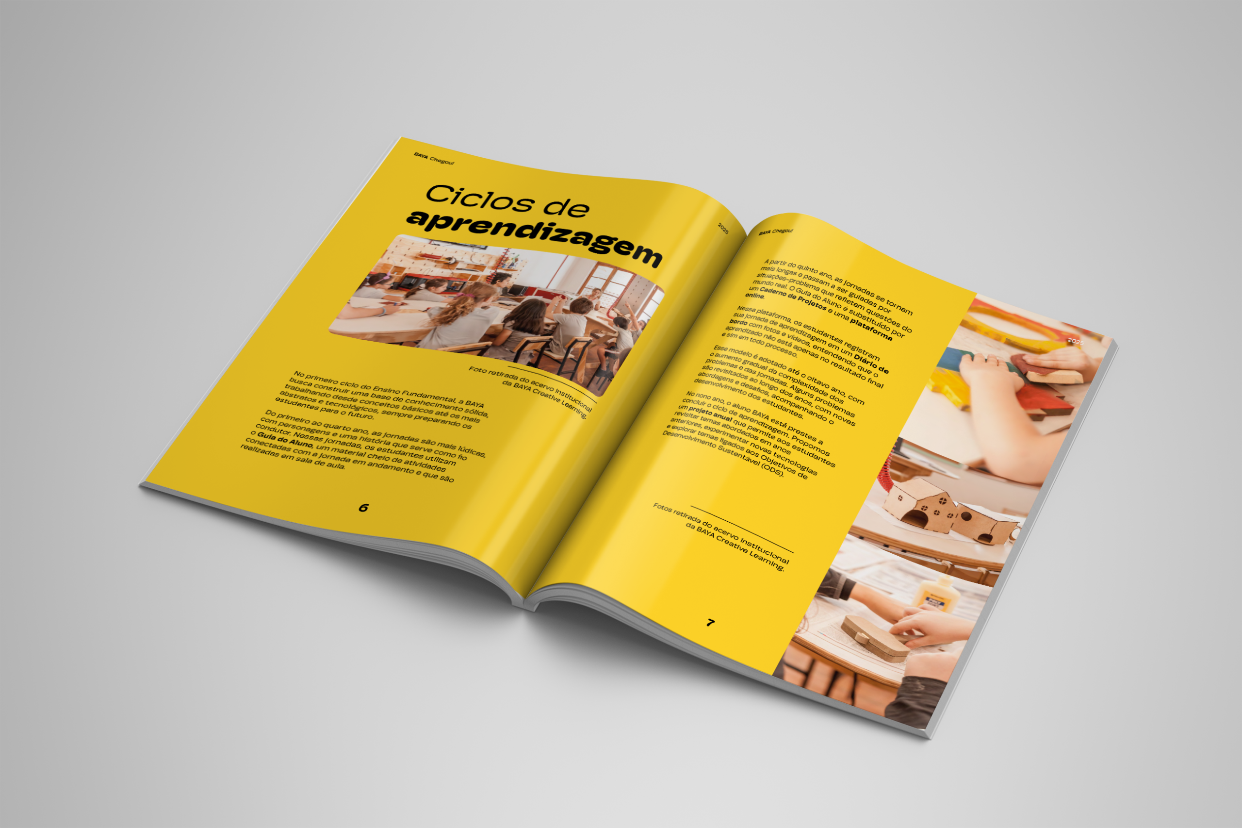 No ano de implementação, todos os estudantes recebem um exemplar físico da revista BAYA Chegou! — um material criado como porta de entrada para o universo BAYA e para a abordagem STEAM. A revista traz atividades do 1º ao 9º ano, inspiradas nas temáticas das nossas jornadas, adaptadas de forma leve e acessível para que possam ser realizadas em casa, com a participação da família e dos amigos. Além da versão impressa, a revista conta com uma versão digital ampliada, com ainda mais propostas para explorar, experimentar e aprender brincando!